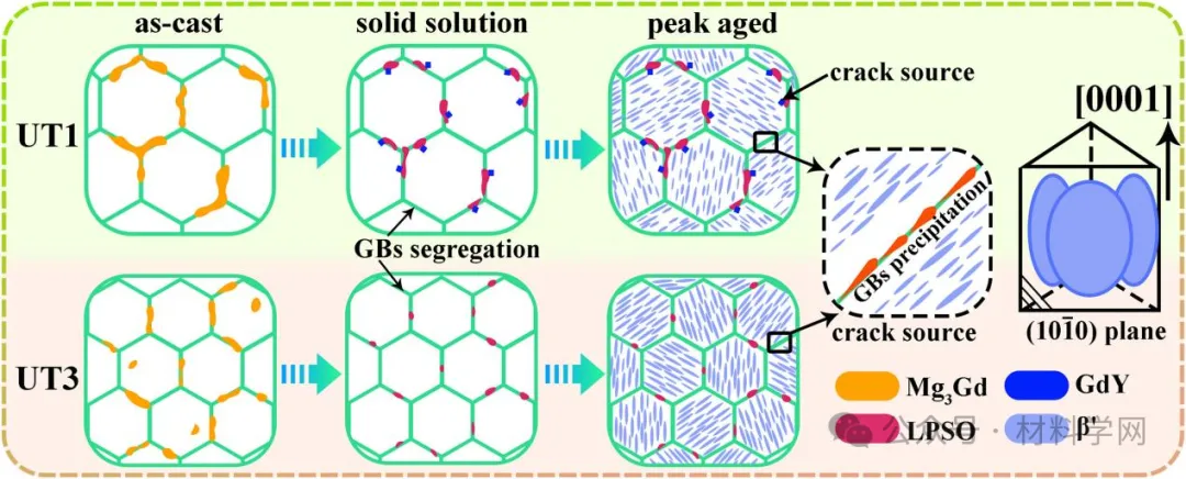 超声波处理不会改变相的组成,但会显著改变它们的分布和尺寸。Mg3Gd相的细化可以减少热处理过程中的溶质偏析,提高Mg的溶质浓度,使得UT3的14H-LPSO相和长方体GdY相的体积分数和面积分数明显低于UT1和UT2。与UT 1和UT 2相比,UT 3基体中更多的溶质原子将进一步提高β'片的长径比和尺寸,并降低β'片的数密度。此外,轴比c/a的提高和时效过程中晶界处Mg5Gd相的长大都将严重降低塑性。综合三种合金的显微组织和力学性能,晶粒细化可以提高应变硬化阶段的加工硬化速率,提高UTS和EL,但对YS几乎没有改善。在相同成分和热处理条件下,β'板的长宽比是提高合金强度的主要原因。