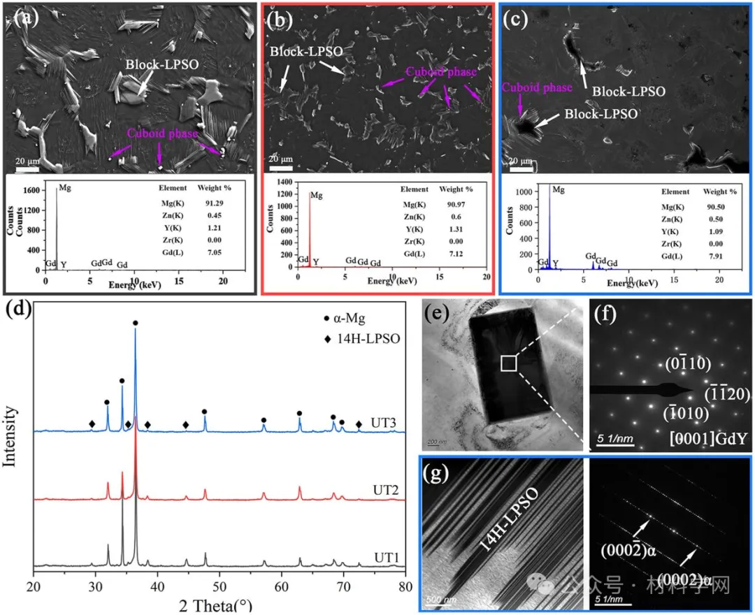 图4所示。峰值时效组织的SEM显微照片(480℃×12 h+200℃×60 h),镁基体的EDS点:(a)UT 1;峰时效组织的SEM显微照片(B)UT 2,(c)UT 3;(d)分别为UT 1,UT 2和UT 3的峰时效合金的XRD图谱;(e-f)长方体形状相的BF-TEM和SAED,用平行于[0001]的入射电子束拍摄;(g)块LPSO的亮场TEM和快速傅里叶变换(FFT)图像,用平行于[110]的入射电子束拍摄。