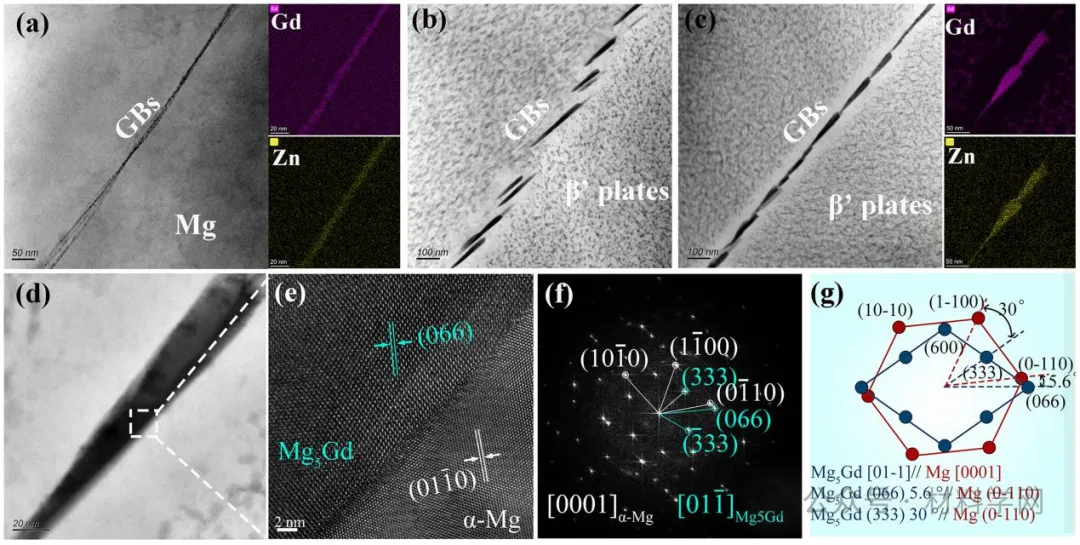 图6所示。UT 1中沿晶析出的TEM照片(z=[0001]α-Mg):(a)固溶体处的BF-TEM和EDS图,(b)时效早期的BF-TEM图(200℃×24 h),(c)峰值时效时的BF-TEM和EDS图,(d)UT 3中晶间沉淀的BF-TEM,(e)晶间沉淀和基体之间的界面的HR-TEM,(f)图6 e的FFT图像,(g)Mg 5Gd相和Mg基体之间的取向关系的示意图。