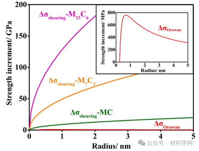 图12所示。通过考虑三种沉淀的剪切机制和Orowan旁路机制,预测了颗粒半径的强度增量。右上角的放大图显示Orowan旁通机构,纵轴单位为MPa。