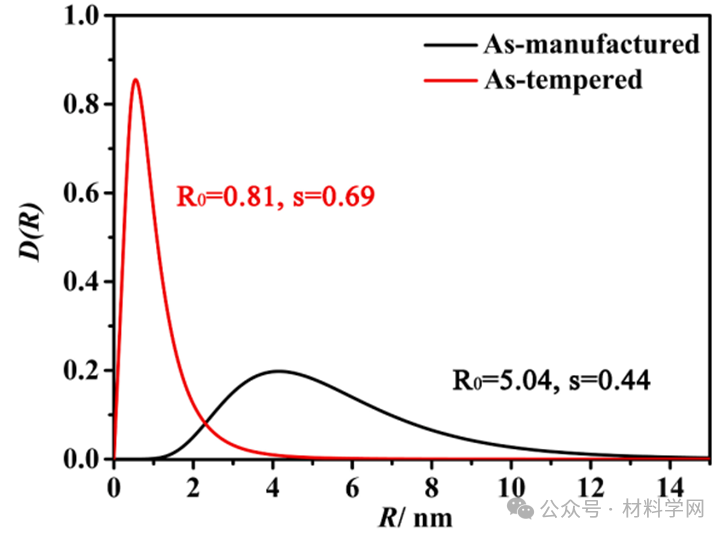 图8所示。制造状态(黑线)和回火状态(红线)的D(R)与R的归一化尺寸分布图,图中列出了拟合参数R0和s。