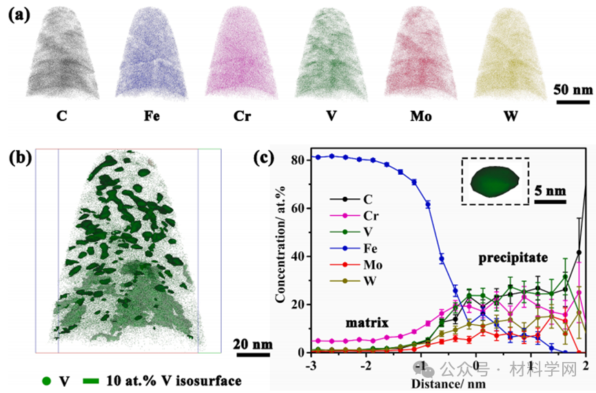 图6所示。回火状态APT分析:(a)选定元素原子图;(b) V的原子图和10 at的等浓度面。% V;(c)从所选颗粒穿过基体-碳化物界面的接近直方图(如图所示)。