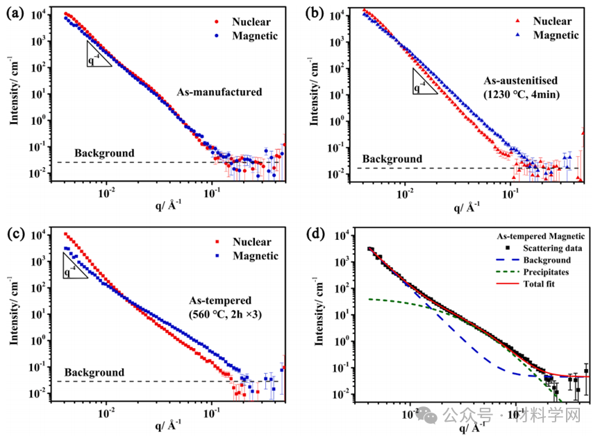 图7所示。一维SANS测量了(a) - (c)中三种样品条件下的强度I(q) vs. q,以及(d)中回火样品条件的拟合结果。(a)制造状态,(b)奥氏体化状态和(c)回火状态下I(q) vs. q的数据图。(a)到(c)中斜率为?4的直线表示Porod定律。注:磁性数据由核+磁性数据减去测量的核得到。