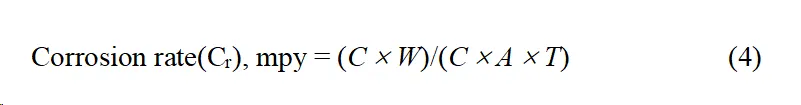 式中,C为常数(C=143.7),W为失重量(g), D为碳钢试样的密度(g/cm3),a为碳钢试样的表面积(cm2),T为试样在腐蚀介质中的暴露时间(h)。碳钢合金编号为No.1080。UNS代号为G10180,密度为7.86 g/cm3,CORRATER乘数为1.00。