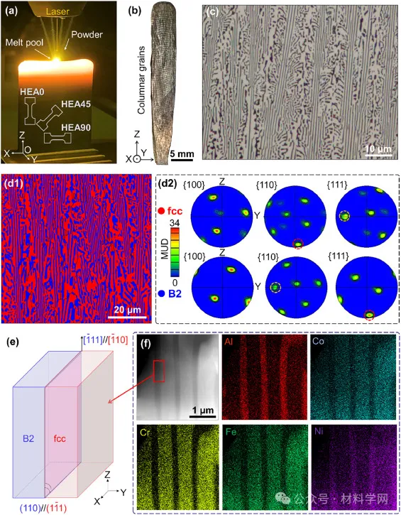 制备的AlCoCrFeNi2.1呈现出由柱状晶粒组成的定向凝固组织(图1(b)),由于高定向温度梯度,这些柱状晶粒沿建筑方向(Z轴)连续生长。柱状晶粒的长度和宽度分别为~10 mm和~1 mm。根据HEXRD分析(补充信息图S1(a)),沉积样品包括fcc相和B2相两种相。图1(c, d1)的显微结构显示了精细的fcc和B2共晶菌落(~ 10-20 μm),由~ 40%的定向片和~ 60%的支化共晶菌落组成(根据补充信息中的图S1(b)计算)。三种样品中fcc相和B2相的含量分别为~ 73%和~ 27%。如图1 (d2)所示,fcc相的{110}极图和B2相的{111}极图均密度(MUD)值在靠近Z方向(即建筑方向)处倍数最大。