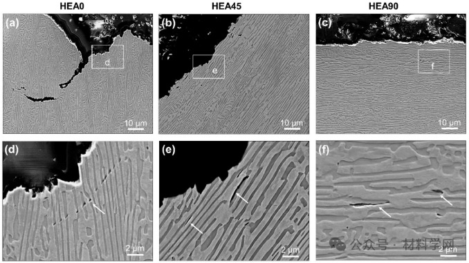 (f) HEA90样品的裂纹成核部位。在HEA0样品中,裂纹在B2相内形核,而在HEA45和HEA90样品中,裂纹沿相界形核。裂缝由白色箭头表示。