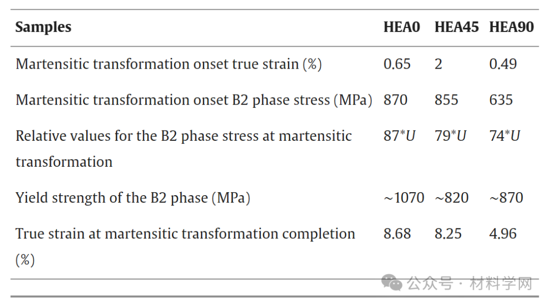 (2)EHEAs中马氏体相变的发生和比例与取向密切相关。对于HEA0和HEA90,马氏体相变发生在B2相屈服之前;对于HEA45,马氏体相变发生在B2相屈服后。