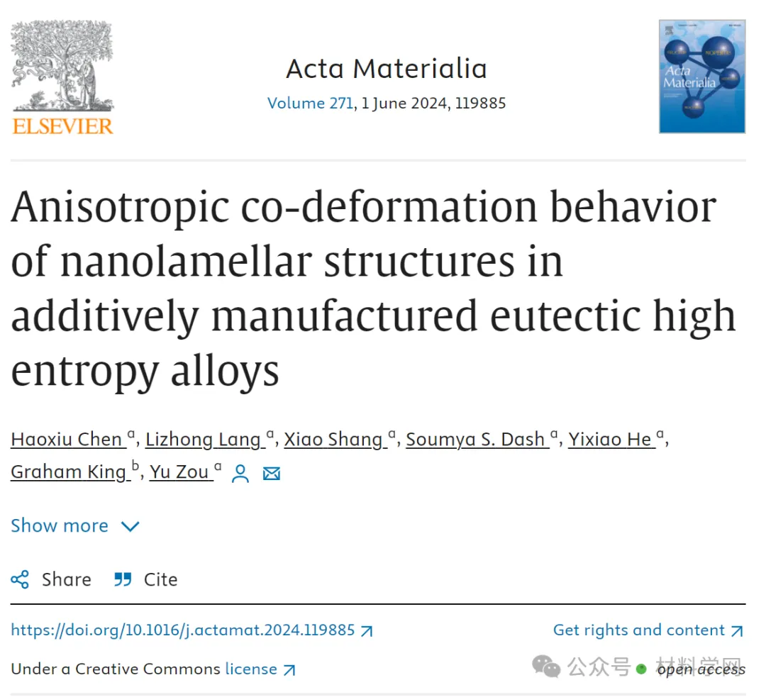 相关研究成果以“Anisotropic co-deformation behavior of nanolamellar structures in additively manufactured eutectic high entropy alloys”发表在Acta Materialia上
