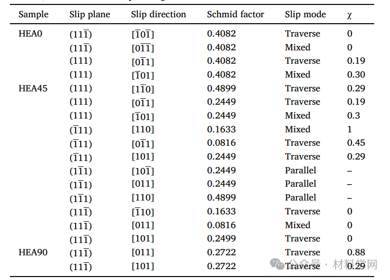 表2 HEA0、HEA45和HEA90屈服后所有可能激活滑移体系的施密德因子和滑移模式。