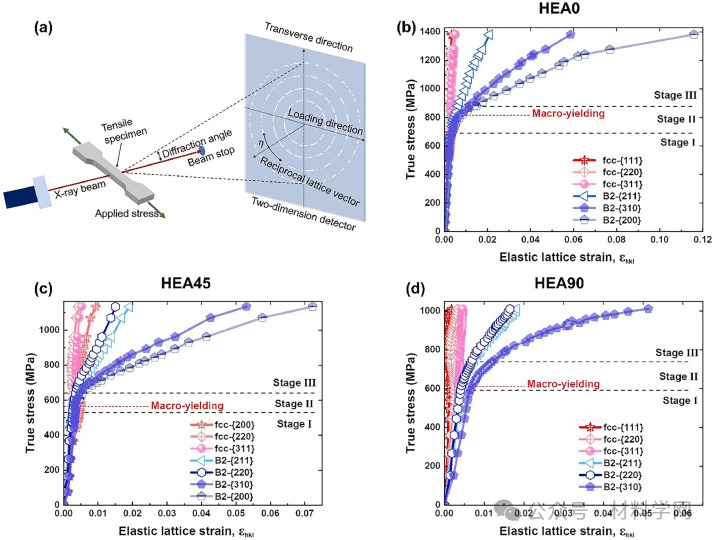 (b) - (d)分别为HEA0、HEA45和HEA90样品中fcc和B2相特定平面的真应力与弹性晶格应变的关系。