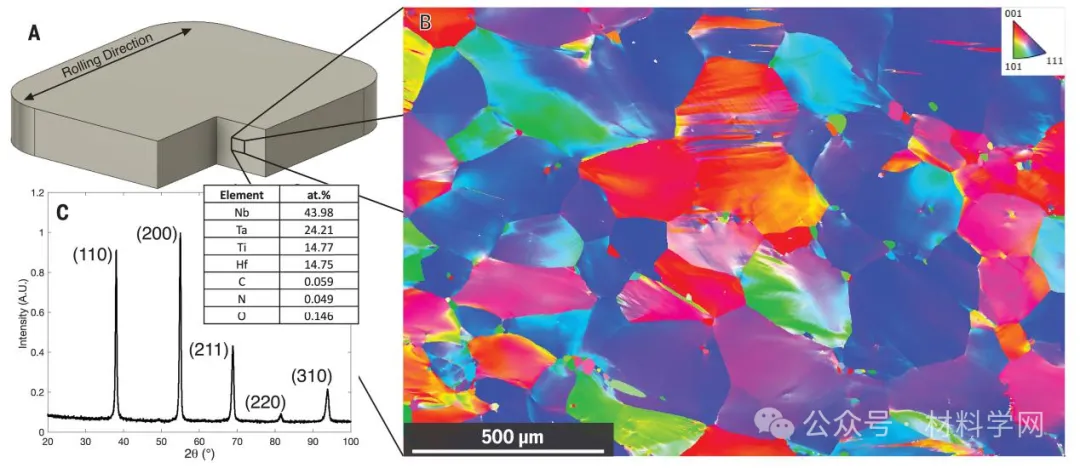具体来说,我们通过进行单轴拉伸试验和基于 J 积分的非线性弹性断裂韧性试验,研究了从 77 到 1473 K 的非碳原子 Nb45Ta25Ti15Hf15 RMEA 的机械性能。这种材料是通过将第 IV 组元素(Ti 和 Hf)与第 V 组元素(Nb 和 Ta)合金化而设计的,目的是:(i) 使材料具有延展性;(ii) 产生晶格畸变以保持高温强度;最值得注意的是:(iii) 优先考虑含有 Zr 和第 IV 组元素浓度较高的 RHEA 所缺乏的高温 bcc 热力学稳定性 (28,29)。有关合金设计细节的更多信息,请参见(30)。为了使材料在化学和微观结构上均质,我们对高纯度元素铸锭进行了多次电弧熔炼,并在室温下进行轧制,使厚度减少约 33%,然后在 1373 K 下热处理一小时并进行水淬。这一过程产生了近乎完全再结晶的单相微观结构,其中有平均尺寸为 270 μm 的等轴晶粒和一些较小的直径为 ~20 μm 的部分再结晶晶粒(图 1B 和图 S1)。X 射线衍射(XRD)(图 1C)证实,该材料形成了单一的 bcc 相,通过电感耦合等离子体原子发射光谱法测得的确切成分为 43.98 原子%(%)Nb、24.21 原子% Ta、14.77 原子% Ti 和 14.75 原子% Hf。