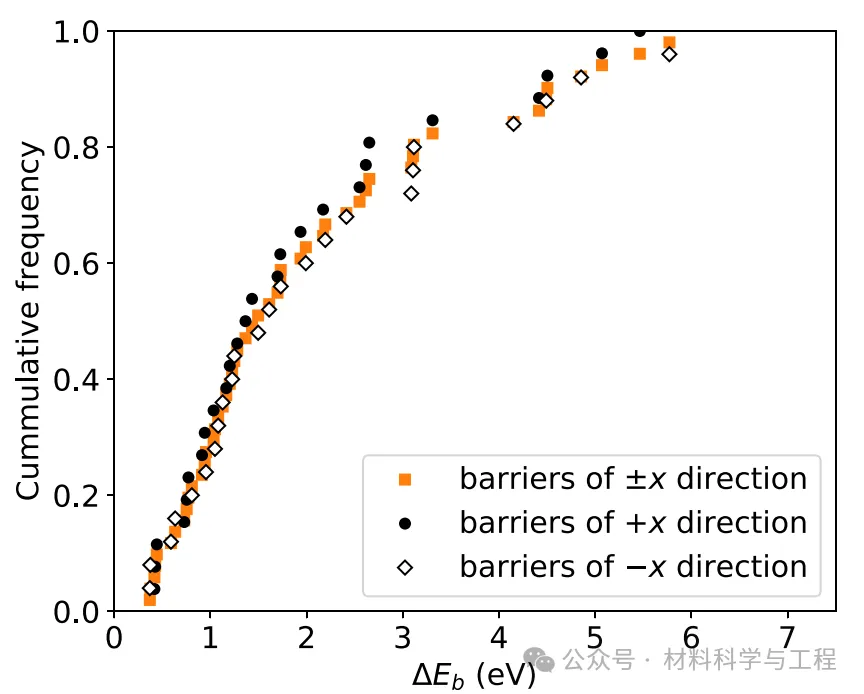 图 6. 位错在 +x 和 -x 方向滑行的能量势垒累积概率分布,以惰性 x(1)=0.8 产生的 SRO 系统为例。平均强化效应会使 +x 方向上的势垒偏小,通过平均两个方向上的势垒,可以消除这种效应。