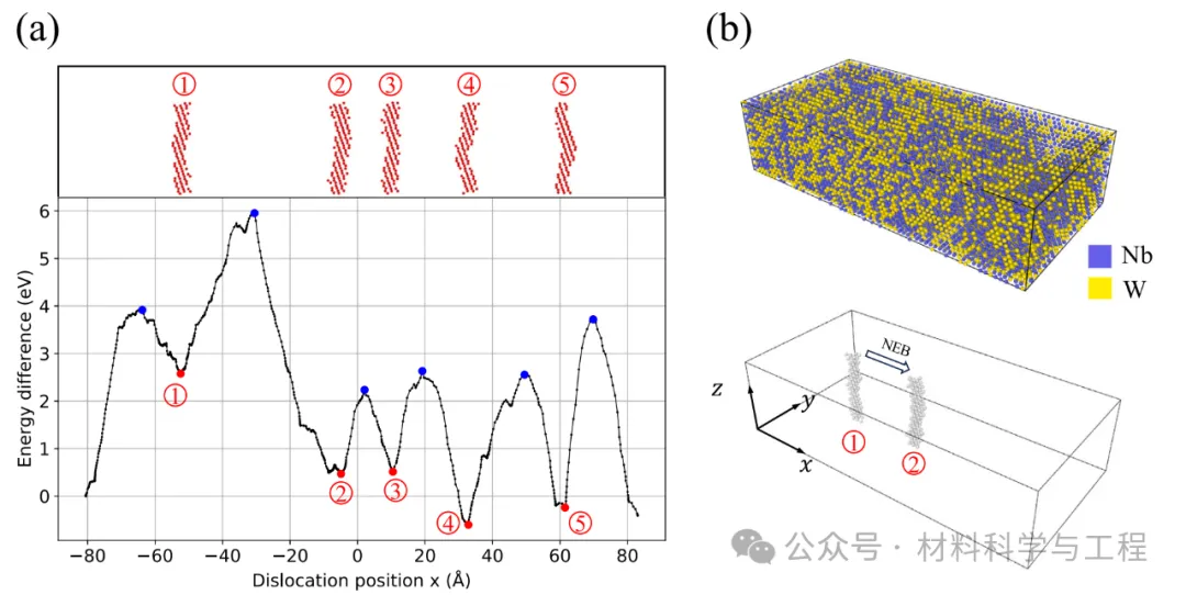 图 5. (a) 在 x(1)=1.3 条件下,蒙特卡罗模拟生成的位错通过一个带有 SRO 的模拟单元时的能量分布与位置关系。最小值和最大值分别标为红色和蓝色。标号对应上图所示的差排构型。(b) 位错位置 1 和 2 之间的原子构型和 NEB 计算示意图。
