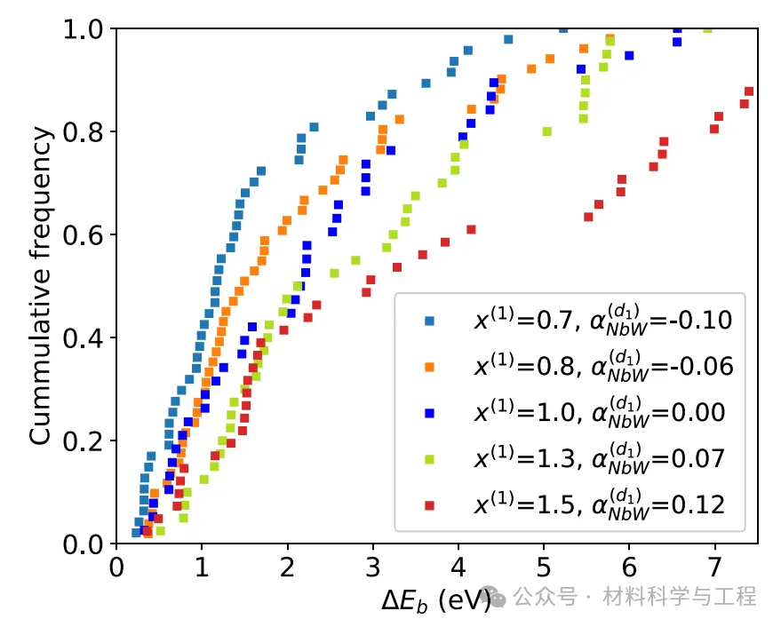 图 7. 能量势垒 ΔEb与 SRO 程度的累积概率分布,由韧度和第一相邻 WC SRO参数表征。x(1)=1.0 相当于随机合金。