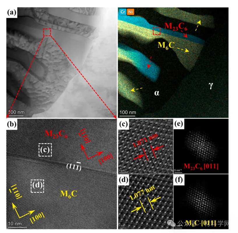 (c、d) (b)中M23C6和M6C次生碳化物的放大图像和(e、f)相应的FFT图。