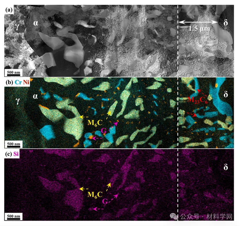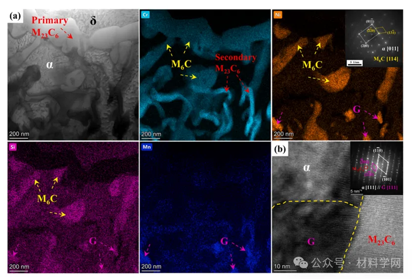 (a)Cr、Ni、Si和Mn的BF图像和相应的EDS元素映射图(图中为M6C碳化物和α-铁素体对应的SAED图),