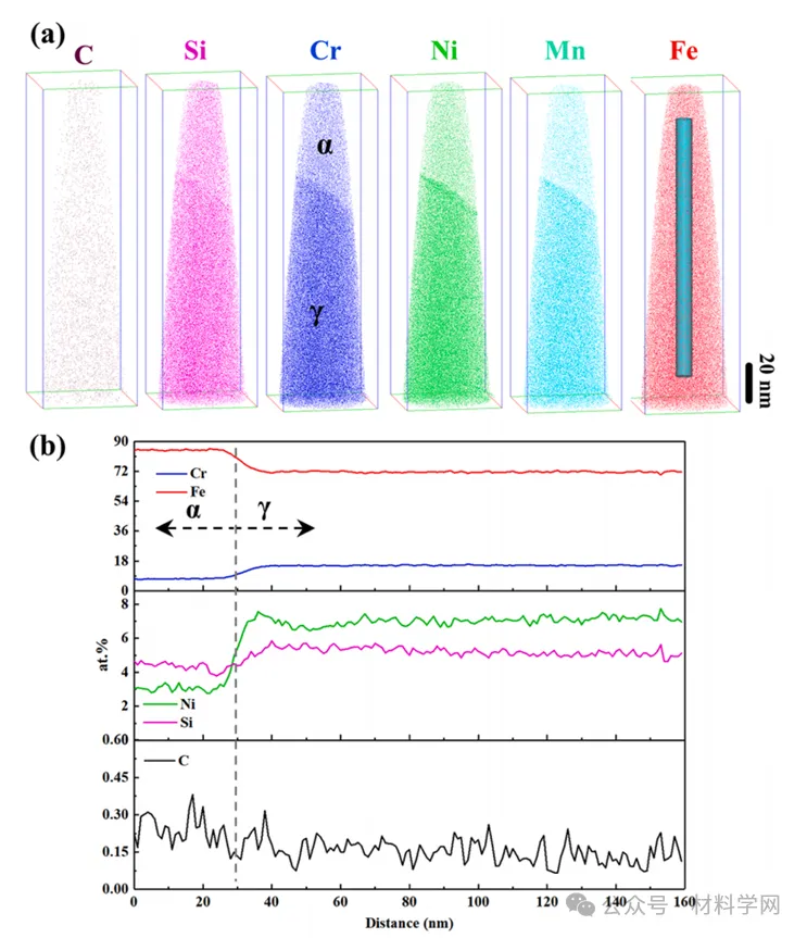 (a)C、Si、Cr和Ni原子映射,(b) 等浓度面35% Cr和20% Ni。
