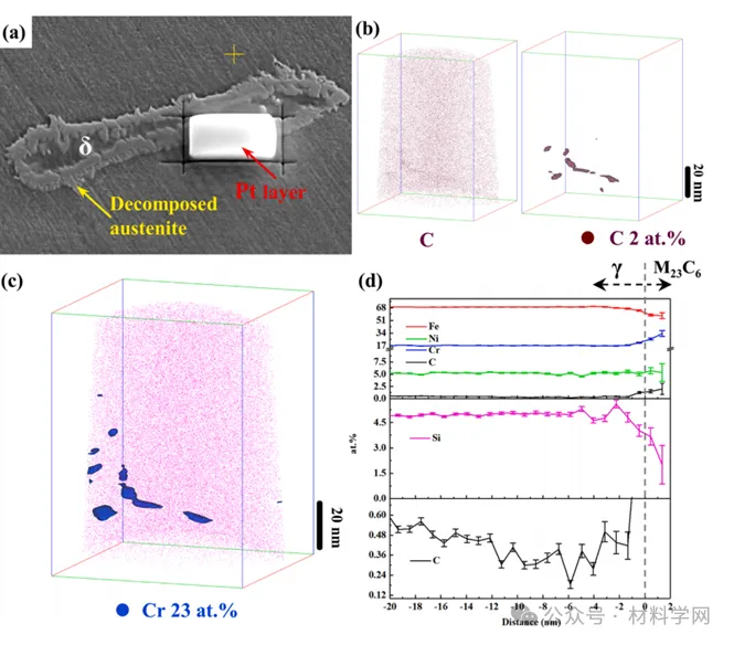 图21(a) APT样品制备位置的SEM图像和(b-d)时效50 h后样品中δ-铁素体附近奥氏体的APT分析。