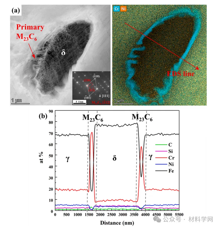 (a)HAADF图像和相应的Cr和Ni组合的EDS元素映射,所示为δ-铁氧体和初生碳化物M23C6对应的选定电子衍射(SAED)图。