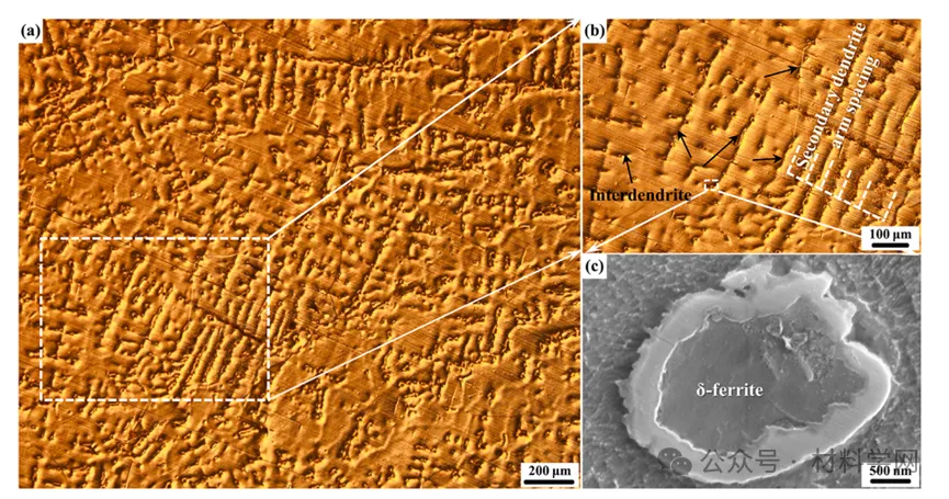 EPMA进一步观察了树突核之间和树突间的元素分布,如图2所示。OM显微图(图1b)和低倍率EPMA显微图(图2a)的综合结果显示,Cr和Si向枝晶间区域偏析,而Ni富集于枝晶核心区域(图2a-d)。可以看出,δ-铁氧体形成于Cr浓度最高的区域。高倍EPMA显微图清楚地显示,δ-铁氧体在树枝晶间区域形成(图2e-h)。在δ铁氧体中观察到Ni的严重耗损和Si的明显富集(图2g和h)。此外,与δ铁氧体内部相比,δ铁氧体周围区域观察到明显的Cr富集(图2f)。