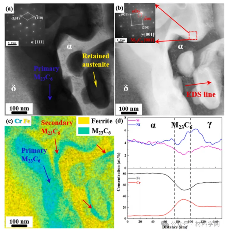 (a)和(b)分别显示了α-铁氧体和M23C6碳化物的SAED模式。蓝色箭头表示初级M23C6碳化物,红色箭头表示次生M23C6碳化物。