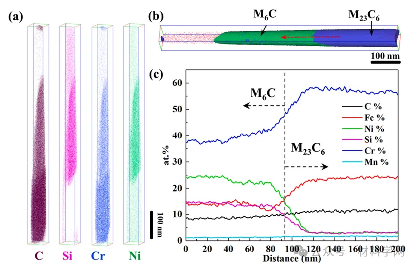 图12时效500 h后Si改性钢的M6C/M23C6界面的APT分析。
