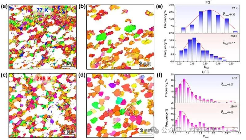 图 4. 在77 K下变形至缩颈的异质结构钛中的(a)UFG 区(<1 μm)和(b)FG 区(>1 μm)的晶粒形貌。在298 K下变形至缩颈的HS Ti样品中,(c) UFG 区(<1 μm)和(d) FG 区(>1 μm)的晶粒形态。在77 K和 298 K下,(e)FG 区和(f)UFG区所承载的真实应变分布。
