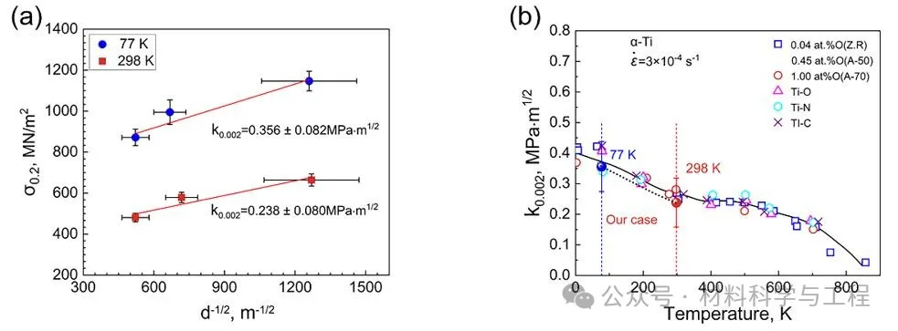 图5. 纯钛材料中与温度有关的Hall-Petch系数 。(a)77 K和 298 K时Hall-Petch系数的实验测量值。(b)Conrad等人对不同间隙元素和含量的钛的Hall-Petch系数随温度变化的曲线图。