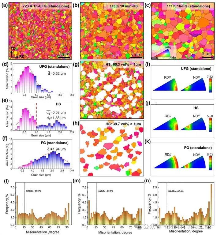 图 1. 均匀结构和异质结构钛的 EBSD 表征。(a)在 723 K退火1h的样品的 IPF 照片。(b)在 773 K退火10分钟的样品的IPF照片。(c)在 773 K退火1h的样品的 IPF 照片。(d-f)三个样品的晶粒尺寸分布。(g-h) 以1mm为阈值将HS晶粒分成两组即>1mm (FG)和 <1mm (UFG)的IPF照片。(i-k)显示微观纹理相似性的反极图。(l)UFG Ti、(m)HS Ti、(n)FG Ti的晶界错向角分布。