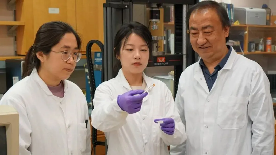李宏斌(右)指导傅凌岚(中)等学生开展研究 这篇在《Nature》上发表的论文,其目标设定可谓是一项前所未有的挑战。在此之前,尽管科研人员为此付出了数十年的辛勤探索,但始终未能实现显著的突破。软骨,这个生物体中的神奇存在,既坚硬又富有韧性,堪称自然界的奇迹。正是这种特殊的性质,让它成为我们身体中的“减震器”,在我们奔跑、跳跃时,承受并分散着巨大的能量,守护着我们的骨组织和肌肉组织不受损伤。然而,当软骨遭受严重且不可逆的损伤时,患者的生活质量将不可避免地受到严重影响。 因此,材料科学家们一直在努力探索替换软骨的可能性。他们试图制造出一种人工支架,其性质尽可能接近天然软骨,以期在生物降解的过程中帮助软骨自我再生。然而,这个过程并不简单,因为人造材料往往难以同时兼具刚度和韧性。坚硬的材料往往容易脆裂,无法与天然软骨相提并论。面对这样的困境,科学家们开始转向大自然寻求启示。傅凌岚在接受《中国科学报》采访时说:“原生软骨之所以既坚硬又韧性,很大程度上是因为其内部的蛋白质和其他分子形成的相互缠绕的网络结构。这种分子链的缠结有助于耗散能量,同时增强材料的强度。因此,我们决定尝试在蛋白质水凝胶网络中引入链缠结,以模仿软骨的这种结构和性质。” 与传统的聚合物水凝胶相比,蛋白质水凝胶具有更好的生物相容性,更容易在生物体内降解。更重要的是,我们还可以通过基因工程技术精确控制蛋白质序列,从而引入具有特定功能的蛋白质基团。这样的尝试不仅为软骨再生提供了新的可能性,也为人类医学的发展注入了新的活力。 傅凌岚向我们揭示了一个令人振奋的科研突破。你知道吗,过去我们所熟悉的蛋白质水凝胶,大多都显得柔软无力,这极大地限制了它们在实际应用中的潜力。但傅凌岚和他的团队不甘于此,他们决心打破这个局限。想要让水凝胶变得坚硬,他们首先需要引入链缠结。然而,传统的串联球状蛋白链长并不足够,使得分子间的缠结成为了一个难题。面对这样的挑战,他们不得不寻找新的方法。于是,他们巧妙地对串联球状蛋白进行了化学解折叠。这个过程就像解开一团复杂的毛线球,让原本紧凑的肽链得以舒展,变得更加细长。 这些伸展开的肽链,仿佛无数条细细的丝线,相互交织、缠结,使得材料的物理交联密度大大增加。但这还不是终点。他们进一步利用光化学交联和蛋白质复性等先进手段,对材料进行了精细的调控和优化。这样的处理不仅使得蛋白质网络更加紧密,而且赋予了材料更强的韧性和抗疲劳性。想象一下,当受到外力作用时,这些原本折叠的蛋白就像弹簧一样,通过解折叠吸收能量,使得整个材料更加坚韧而不易破裂。这样的设计,使得他们最终获得了一种既坚硬又具有韧性的新型蛋白质水凝胶。令人瞩目的是,这种新材料的硬度相比天然蛋白交联后的软材料提高了惊人的40倍!而且,它的压缩模量更是高达1.7 MPa,这与我们身体中的软骨组织相媲美。 更令人兴奋的是,这种水凝胶在经过600多次的反复快速压缩后,依然保持着出色的性能,没有出现明显的疲劳和损伤。“这个结果让我们非常振奋!”傅凌岚难掩激动之情。确实,这一突破不仅为我们打开了一个全新的材料应用领域,更为未来生物材料的发展提供了无限可能。 傅凌岚与导师李宏斌合影 在充满希望的2020年,他们曾怀揣着对科学的热爱,满怀激情地将这项革命性的研究成果投向了全球顶尖的学术期刊Nature。然而,命运似乎给他们开了一个小小的玩笑,他们的稿件并未获得预期的认可,遭到了拒稿的待遇。不过,值得一提的是,三位审稿人都对这个新材料展现出了浓厚的兴趣,他们期待能在生物体内亲眼见证这种材料修复软骨的神奇效果。对于课题组而言,这无疑是一个巨大的挑战。毕竟,他们过往的经验中鲜少涉及动物实验这片神秘的领域。但正是这次挑战,让他们看到了突破自我、探索新知的机遇。于是,李宏斌教授毅然决然地接受了这个挑战,他决定带领团队迎难而上,勇攀科研高峰。为了验证新材料在生物体内的效果,他们与南京大学医学院附属鼓楼医院的蒋青教授团队紧密合作,利用兔子构建了动物实验模型。两年的漫长探索与无数次的实验尝试,终于迎来了令人振奋的喜讯。在膝关节软骨受损的兔子体内植入蛋白水凝胶后,仅仅12周的时间,这些兔子的膝关节软骨便展现出了明显的再生迹象。研究人员进一步检测了这些新生组织,发现它们的理化性质与天然软骨极为相似。更为惊喜的是,兔子体内既未出现未降解的凝胶残留物,也未产生任何排异反应。这一发现无疑为新材料在生物体内的应用提供了有力的支持。有趣的是,在探索过程中,他们发现软骨的再生效果与蛋白质水凝胶的硬度之间存在着一种比想象中更为复杂的关联。偏硬的凝胶似乎比偏软的凝胶在修复软骨方面效果更好,这可能是因为较高的硬度使得凝胶与骨骼和软骨组织的相容性更佳,从而为身体提供了有效的再生线索。然而,当水凝胶的硬度过高时,修复效果却会受到影响,可能是因为这样的凝胶在体内降解速度过慢。在补充了完整的动物实验结果后,他们信心满满地将论文重新提交给了Nature。这一次,他们的努力终于得到了认可,论文很快便通过了审稿。李宏斌教授笑谈道:“动物实验确实比一般的材料学研究周期