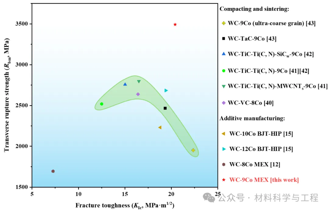 采用WC-Co硬质合金MEX-DS技术制备出近全致密两相WC-9Co硬质合金,其横向断裂强度达到了3492MPa,断裂韧性达到了20MPa·m1/2以上,将目前AM制备的WC-Co硬质合金横向断裂强度从1500-2000 MPa、2000-3000 MPa(HIP处理)提高到了3000-4000MPa级,断裂韧性提高到了20MPa·m1/2以上,综合力学性能明显优于目前报道的同类研究结果,与粉末冶金制备的同类产品相当。研究结果对解决当前硬质合金增材制造出现的难以消除的孔隙、裂纹及有害相等难题,发展硬质合金增材技术具有重要的意义。