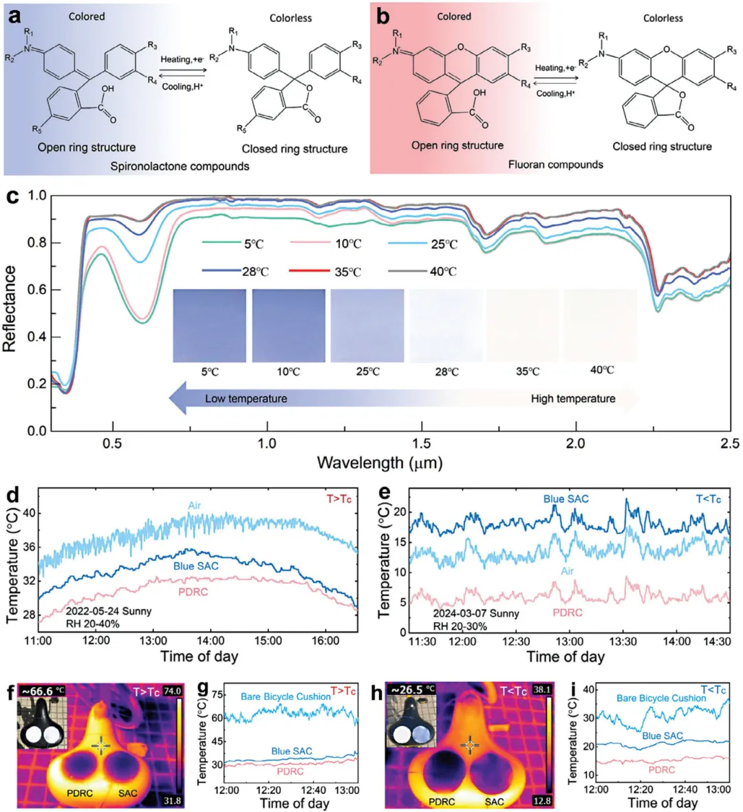 控制全球温室气体排放,对遏制全球变暖至关重要。无能源被动式日间辐射冷却(PDRC)涂层通过0.3-2.5μm的阳光反射,有效降低能源消耗,同时通过8-13μm的大气透明温度将热量输送到外层空间。近年来,科研人员已开发出多种PDRC材料,包括精心设计的涂层、元织物、元陶瓷、光谱选择性冷却器和多孔膜,即使在炎热天气中也能实现有效冷却。然而,高极反射率和强红外发射率在寒冷天气中可能导致过度冷却。为了满足全年热管理的需求,已设计出各种主动自适应系统,如电致变色设备和电调谐设备、具有双模飞行的机械可切换系统等等。然而,这些系统依赖于复杂的刺激或需要额外的能量来进行模式切换,这限制了它们的实用性。被动自适应辐射冷却的最新进展催生了多种热致变色材料,如VO2、锗锑碲化物、钙钛矿、热致变色微胶囊、热敏水凝胶、热诱导可再结晶结构、光学诱导材料和湿度敏感材料。这些材料旨在调节热不透光性,或在反射太阳能和允许光传输/吸收之间进行自主切换。尽管取得了进展,但大规模应用仍面临挑战。例如,VO2涂层需要复杂的光学谐振结构,锗锑碲化物和钙钛矿成本高昂且相变点固定,热敏水凝胶需要封装,光学/湿度敏感材料则面临稳定性和响应性问题。户外应用时,灰尘、雨水和细菌污染会影响光学性能和冷却/加热效果,使这些材料在实际使用中不可持续。因此,开发能够适应季节性温度变化同时保持超疏水自清洁功能的可扩展被动涂层,对其实际应用至关重要。然而,在超疏水涂层中将被动冷却和加热功能与冲突的光学特性相结合,仍然具有挑战性。近日,陕西科技大学薛朝华教授、华中科技大学陶光明教授、香港理工大学王钻开教授联合报道了受荷叶分级结构的启发,通过简单的一步相分离过程,制备了一种超疏水一体冷却(SAC)涂层,同时具有表面润湿性、光学结构和温度自适应能力。该涂层表现出不对称的梯度结构,具有表面嵌入的疏水性SiO2颗粒和在垂直分布的分级多孔结构内的表面下热致变色微胶囊。此外,该涂层具有超疏水性、高红外发射和可热切换的阳光反射率,能够在辐射冷却和太阳变暖之间实现自主转换。该一体化涂层有效避免了传统辐射冷却材料造成的污染和过冷问题,为智能调温涂层的大规模生产开辟了新的前景。相关研究工作以“Bioinspired Superhydrophobic All-In-One Coating for Adaptive Thermoregulation”为题发表在国际顶级期刊《Advanced Materials》上。在这项研究中,SAC涂层设计受植物叶片启发,如图1a所示,其梯度结构、栅栏组织、海绵层和下表皮均被借鉴。此外,植物叶片在大气透明窗口中具有较高的发射率。叶片的表皮作为保护屏障,包含上表皮和下表皮,而某些表皮细胞如荷叶,拥有低表面能蜡状和微纳米乳突结构,使表面具有超疏水性。栅栏组织富含叶绿体,位于上表皮下方,呈网格状排列;海绵组织则含有松散排列的叶绿体,位于栅栏组织之下。叶片上表面深色,下表面浅色,这种叶绿体分布的不对称性使光合效率提高。图1b为SAC涂层的示意图,灵感来自于荷叶的梯度结构。该涂层实现超疏水性和热光性的空间分离,其核心为含有P(VDF-HFP)和SiO2纳米颗粒的复合材料组成的微米/纳米结构孔分层排列。涂层上表面具有由低表面能聚合物P(VDF-HFP)组成的微纳多孔结构,中间穿插着疏水性SiO2纳米团簇,模拟荷叶上表皮特性,维持光学性能。微尺度P(VDF-HFP)/SiO2复合孔隙填充热致变色微胶囊(TCMC),而下层孔隙未填充,形成分层结构,包括微胶囊富集层和分级多孔层。TCMC响应温度变化,并与涂层的多孔结构协同工作,以调节阳光的光谱特性,实现高温反射和低温吸收。分级多孔层显著散射阳光,提高反射效率。P(VDF-HFP)作为主要基质,提供疏水性和红外发射特性,而SiO2增强红外发射率。涂层整合紫外线吸收剂、光稳定剂和抗氧化剂,以增强耐光性。这种多方面设计将红外发射、阳光反射/吸收和表面润湿特性融合到同一材料中,以实现能够提供无能量的夏季冷却和冬季变暖的超疏水一体式涂层。图2. SAC涂层在不同天气条件下的温度相关颜色转换、光学变化和自适应测试图3. SAC涂层的润湿性、机械坚固性和户外耐久性通过不对称梯度将热致变色微胶囊包埋到多孔结构中,制备了具有灵活热调节能力的无能量超疏水涂层。涂料旨在提供全年的热舒适性,实现冬暖夏凉。通过一步相分离过程实现,涂层将表面不可润湿性、被动冷却和加热与相互冲突的光学特性协同集成,使其能够在太阳能吸收率和吸收率之间自主切换,以适应温度变化和恶劣环境。值得注意的是,采用的溶液处理制造方法不仅简单,而且能够在同一涂层中集成了多种理想性能,为大规模制造智能热调节涂层铺平了道路。这种一体化的设计策略为全年节能提供了一种有前景和可持续的解决方案。