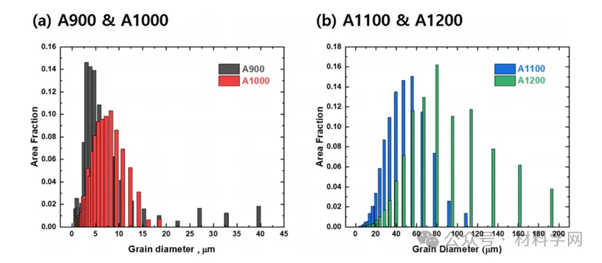 图3 (a)A900和A1000和(b)A1100和A1200样品的粒度分布。