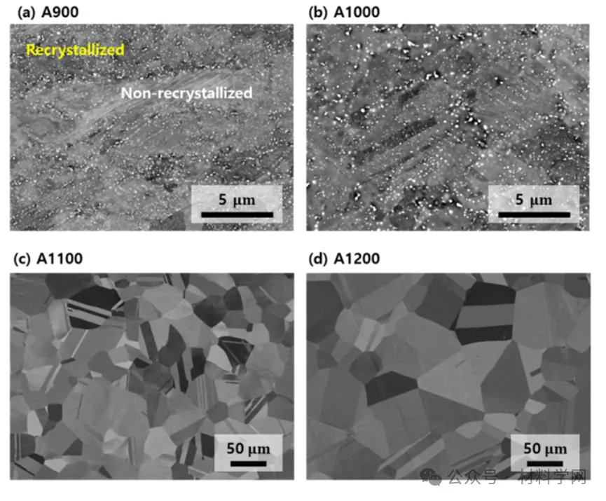 图1 (a)A900、(b)A1000、(c)A1100 和(d)A1200样品的 BSE 图像。