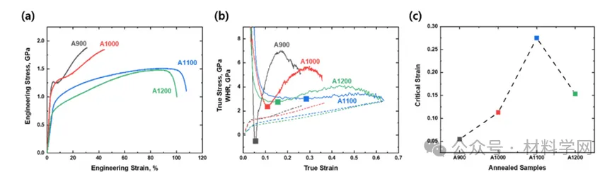 图5 在液氮温度(77 K)下进行的拉伸试验结果。(a)工程应力与应变曲线,(b)真实应力和WHR与真实应变曲线,以及(c)不同退火条件下FeMEA样品的临界应变图。
