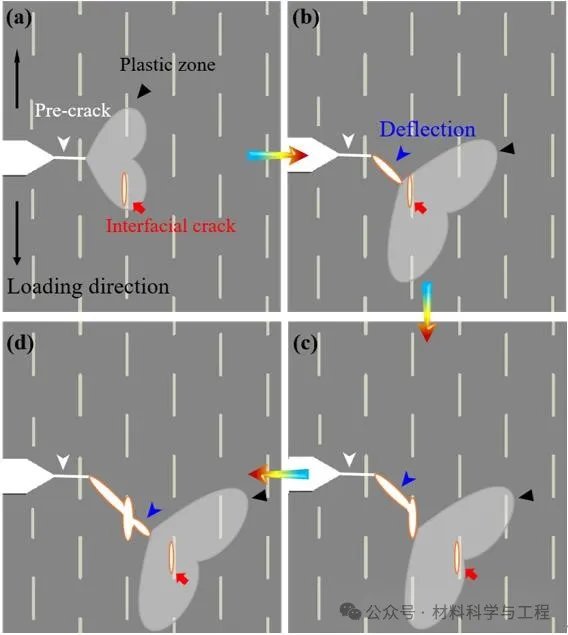图 4. 垂直于轧制方向试样的裂纹扩展。(a)未断裂试样宏观断裂侧面的扫描电镜显微照片,显示了主裂纹的扩展。(b-d)特征区域的相应放大图。