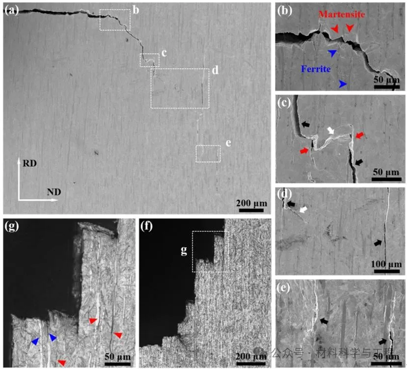 图 3. 沿轧制方向样品的裂纹扩展。(a)未断裂试样宏观断裂侧面的扫描电镜显微照片,显示主裂纹的扩展。(b-e)特征区域((a)中白色虚线框)的相应放大图。(f)断裂试样侧面的光学图像,显示主裂纹呈锯齿状扩展。(g)特征区域的放大图。