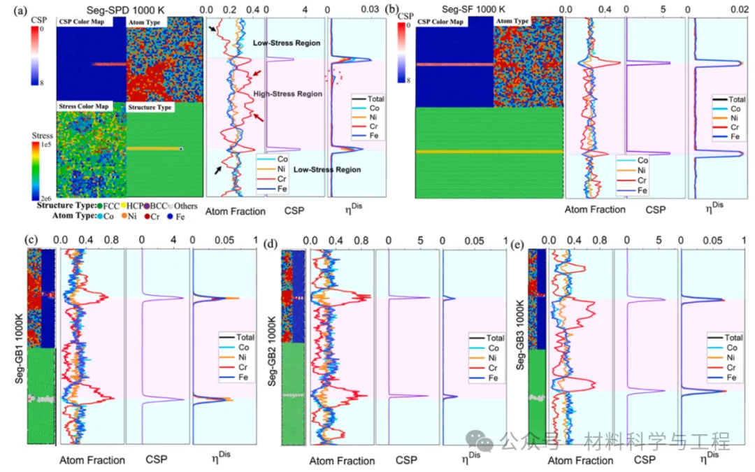 图 2. 在 1000 K 下通过 MC/MD 模拟获得的 25Fe 中不同缺陷模型的典型原子构型及相应的原子分数、CSP 和结构紊乱参数 (ηDis)剖面,分别为 (a) SPD、(b) SF、(c) GB1、(d) GB2 和 (e) GB3。原子构型通过原子类型、应力、CSP 和结构类型的四个或三个彩色编码面板进行说明。原子构型视图后显示了随位置变化的相应偏析相关属性,包括成分、CSP 和无序。