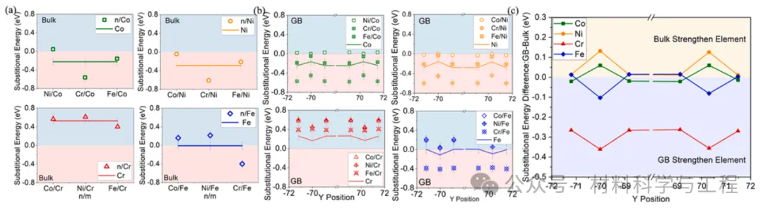 图 9. n/Co(n=Ni、Cr、Fe)、n/Ni(n=Co、Cr、Fe)、n/Cr(n=Ni、Co、Fe)和 n/Fe(n=Co、Ni、Cr)的置换能,以及它们在 25Fe (a) 块体和 (b) GB2 位点中沿 y 方向的平均值。物种 m 的平均置换能是 m 被 n 替代时的平均能量变化(n≠m)。例如,Co 表示 Ni/Co、Cr/Co、Fe/Co 的平均能量。(c) 25Fe 中 GB 与主体(GB-Bulk)平均取代能之间的取代能差。