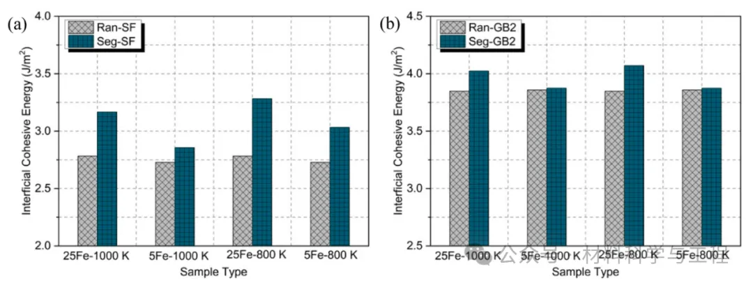 图 5. (a) SF 和 (b) GB2 模型中的界面内聚能。Ran 模型是随机系统。Seg 模型是在800 K 和 1000 K 下经过 MC/MD 处理的系统。