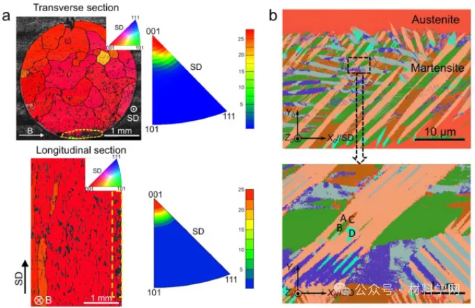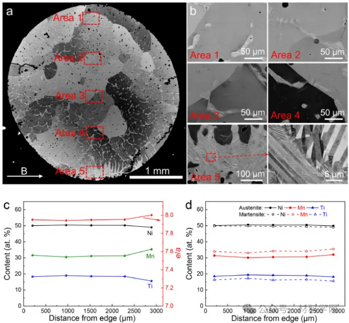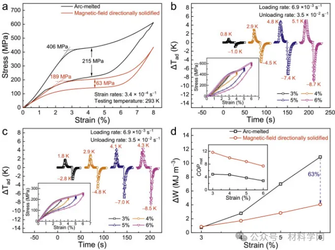 导读:形状记忆合金中的弹性热效应依赖于与应力诱导马氏体转变相关的潜热,可用于固态冷却应用。然而,一阶转变固有的大应力滞后极大地限制了能量转换效率和工作温度窗口。在这里,通过利用成分梯度工程来定制机械滞后,并利用微结构纹理来促进弹性热响应,我们通过磁场辅助定向凝固制造出了具有 <001>A 优先取向的成分级配Ni50Mn31.5Ti18.5合金。由于凝固过程中施加的横向磁场诱发了成分偏析,大量预先存在的马氏体畴嵌入到奥氏体基体中,从而降低了马氏体转变的临界驱动应力和应力滞后。结合高度优选取向所带来的大冷却能力,该材料的性能系数得到了极大改善。此外,该材料还实现了从 263 K 到 463 K 的 200 K 宽制冷温度跨度,最大绝热温度变化为 -18.4 K。