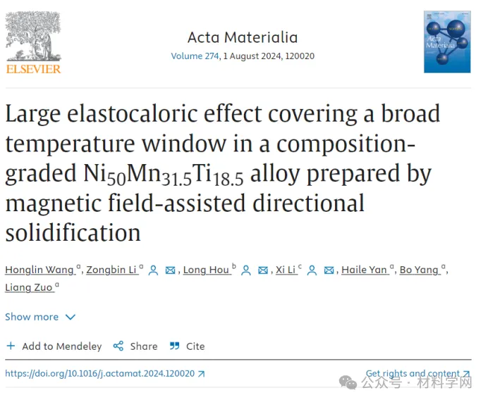 相关研究成果以“Large elastocaloric effect covering a broad temperature window in a composition-graded Ni50Mn31.5Ti18.5 alloy prepared by magnetic field-assisted directional solidification”发表在Acta Materialia上