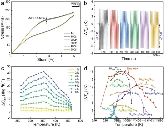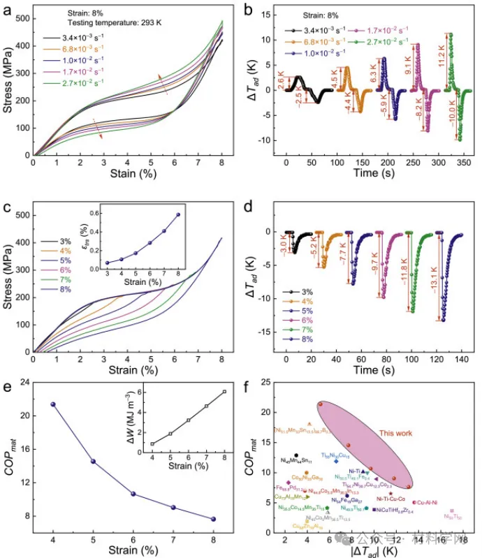 然而,由于材料的性能系数(COPmat)与能量耗散 ΔW 成反比[21],一阶结构转换所固有的大应力滞后(代表在超弹性循环过程中作为热耗散而损失的功值)不利于有效的能量转换[20]。此外,较大的滞后还会导致功能稳定性显著下降 [22],甚至影响工作温度窗口 [5]。