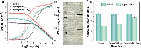 图6. 风干实验后不同涂层的防腐性能。(a)不同涂层在3.5 wt.% NaCl溶液中风干384h和浸泡48 h后的Bode图;(b1)空白环氧树脂涂层(b2) EP/ MSN5%涂层和(b3) EP/MSN-TA5%涂层在3.5wt.% NaCl溶液(比例尺:200μm)中风干384h和浸泡48h后的光学图像; (c)不同涂层在风干实验384h前后的拉开附着力测试结果(误差条代表三个独立样品的标准差)。