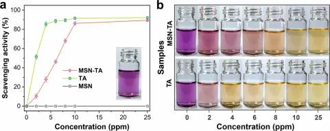 图4. MSN-TA纳米容器对DPPH自由基的清除能力。(a)反应30min后不同浓度的MSN,MSN-TA和TA对DPPH自由基的清除能力。插图是DPPH与25ppm MSN反应的数字图像(误差条表示三个独立样本的标准差); (b)DPPH与不同浓度的MSN-TA和TA反应的数字图像。