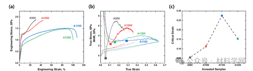 图5 在液氮温度(77 K)下进行的拉伸试验结果。(a)工程应力与应变曲线,(b)真实应力和WHR与真实应变曲线,以及(c)不同退火条件下FeMEA样品的临界应变图。