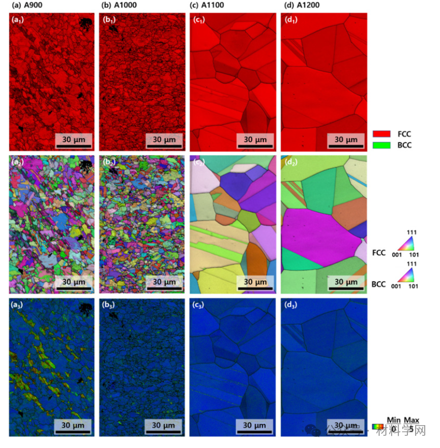 图2 EBSD分析了(a) A900、(b) A1000、(c) A1100和(d) A1200样品的结果。EBSD (a1-d1)相图,(a2-d2) IPF图,(a3-d3) KAM图。