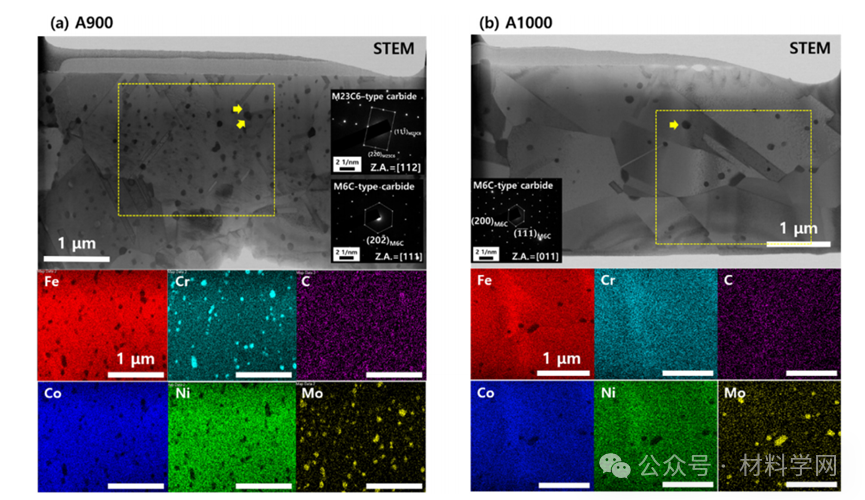 图4 (a)A900 和(b)A1000 样品的 TEM 分析。STEM 图像中突出显示的区域显示了拍摄 EDS 元素图的区域。