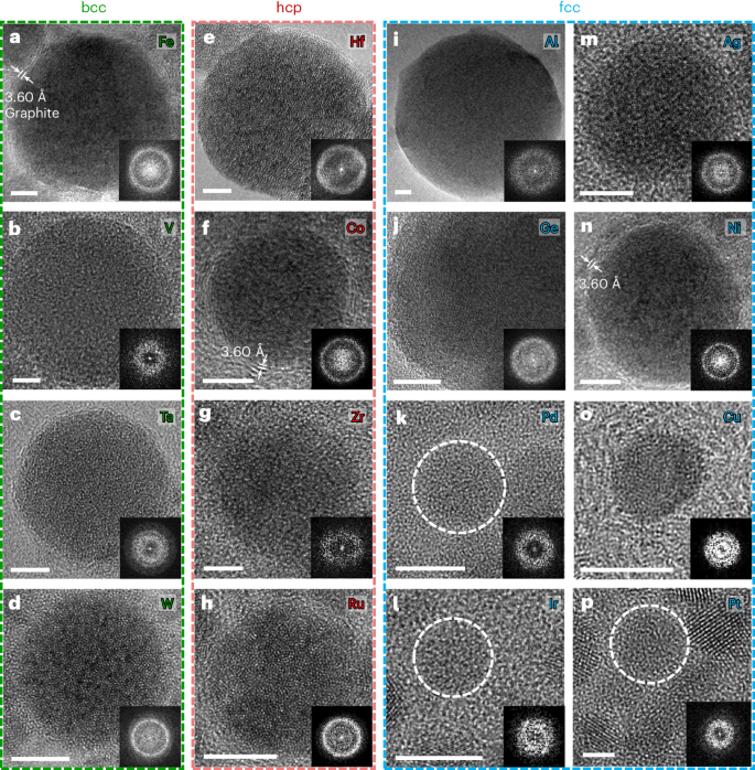 为了证明该方法的普适性,作者系统地研究了玻璃化更多单原子金属的可行性,包括具有bcc、hcp和fcc晶体结构的金属。应用这种方法,作者将十几种(总共17种)单原子金属玻璃化成玻璃态,并获得了各种MM GNP(图3)。图3a-d分别显示了bcc金属铁(Fe)、钒(V)、Ta和钨(W)的结果,也可以通过其他方法进行玻璃化7、11。图3e-h显示了分别由hcp金属铪(Hf)、钴(Co)、锆(Zr)和Ru玻璃化的MMG纳米颗粒。图3i-p显示了由fcc金属生产的更多MMG,包括主族金属(铝(Al)和锗(Ge))和过渡族金属(Pd、铱(Ir)、银(Ag)、Ni、铜(Cu)和铂(Pt))。