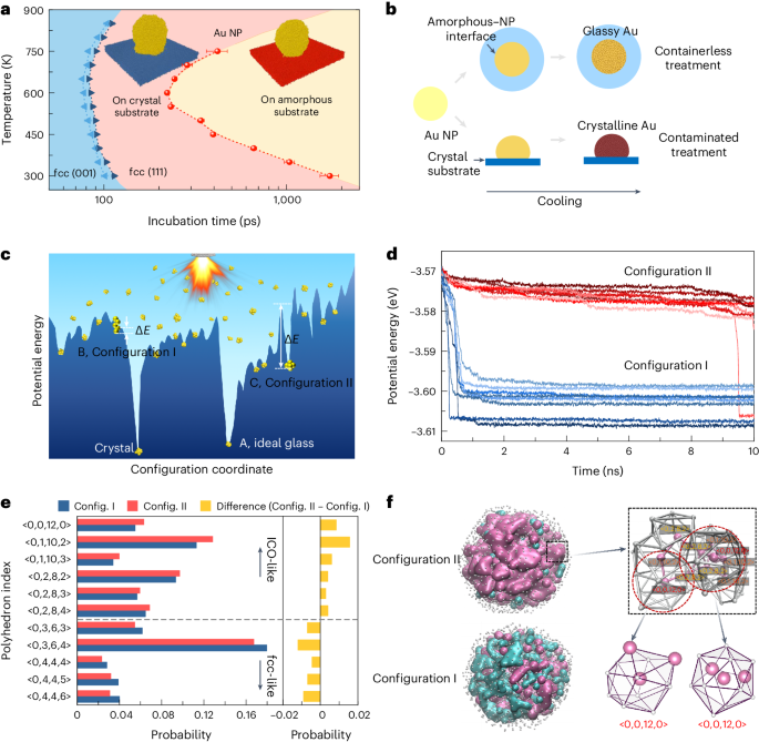 为了说明冷却阶段液体介质的影响,作者对具有两种不同类型基底的Au模型系统进行了MD模拟。一个纳米颗粒位于无定形基质上,类似于液体介质中未受污染的条件;另一个位于提供异质成核的晶体基底(fcc(100)和fcc(111))上。实验结果表明,fcc单原子金属的玻璃化可以在非常相似的冷却速率(1013Ks-1)下实现,这表明液体介质对MMG形成的重要贡献,即也就是说,超快的冷却速率,抑制异质成核并促进玻璃形成。作者准备了一个示意图来比较AuNP快速冷却过程中无容器/未污染的条件与受污染的处理边界条件(图4b)。模拟与实验观察结果一致,即包括Au在内的贵方FCC金属可以在快速冷却过程中在无容器/未污染的条件下玻璃化。另外,通过该方法减小样品尺寸以生成纳米级颗粒可以降低在这些小体积中遇到污染物的可能性,从而降低异质成核的可能性,异质成核促进非晶结构的形成。